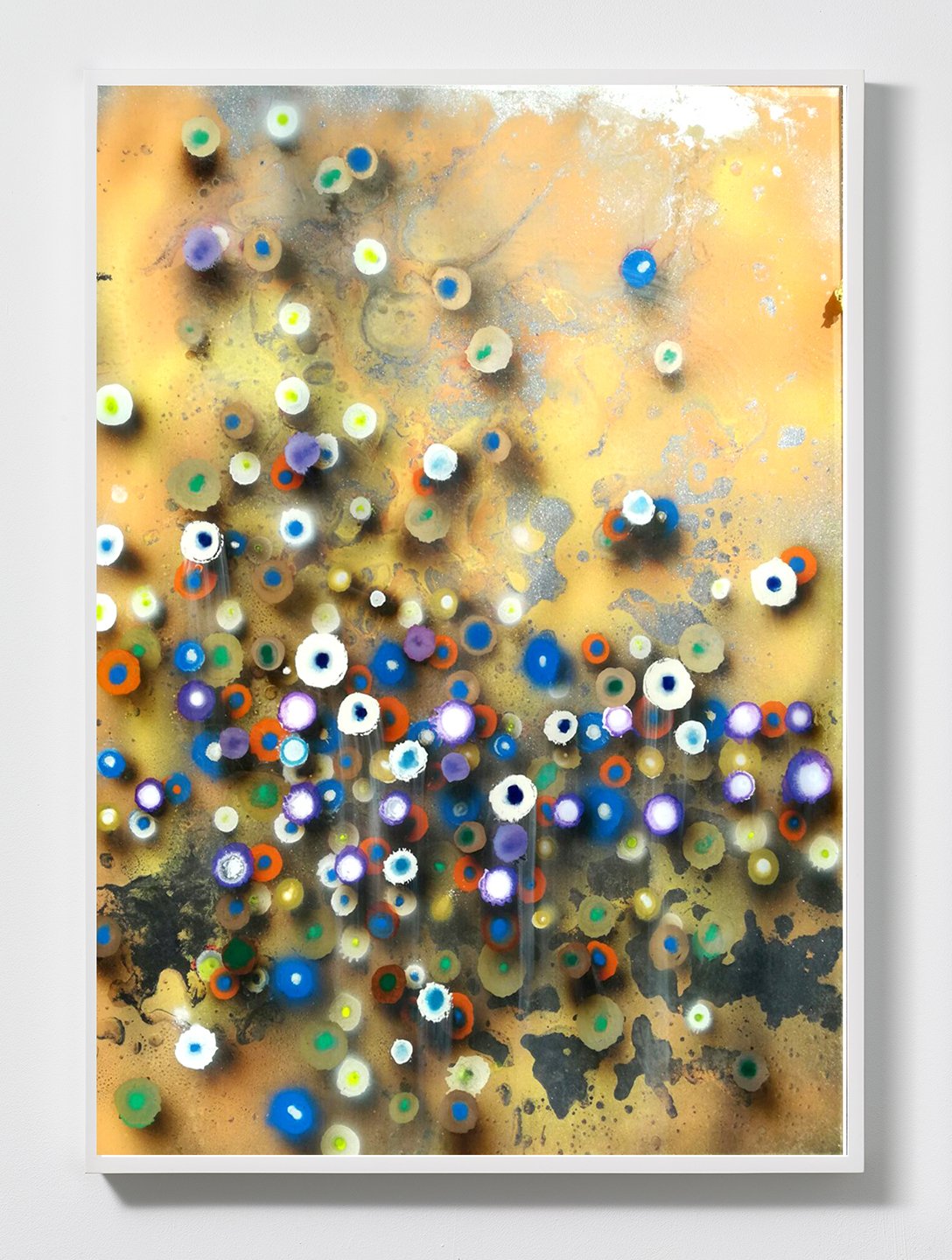 Giacinto Occhionero’s paintings include naturalistic, neon, and metallic colors that cascade as particles in an imagined atmosphere. He creates each work in a process of reverse painting on plexiglass, tapping the nozzle of spray cans to release paint onto the surface in overlapping circles. Rips, fissures, and tiny holes appear as painted elements held back from the eye by a glossy partition. As the artist describes to critic Alan Jones, "At a certain point I got rid of the canvas completely. My perfectionist attitude kept me from ever being altogether satisfied, because having the canvas to work on permitted you to impose additional elements. Back-painted plexi saturated itself with color and, when that happens, it's finished." Giacinto Occhionero lives and works in Rome, Italy. He was born in Campobasso in 1975 and attended the Accademia delle belle arti in Rome. His works have been exhibited at Kristen Lorello, NY, the Fondazione Sandretto Re Rebaudengo, Torino, Italy, and 68 Projects, Berlin, Germany, among other venues. Collections include the Capital Group, Los Angeles, CA, and the Collezione Banca Profilo, Milan, Italy.