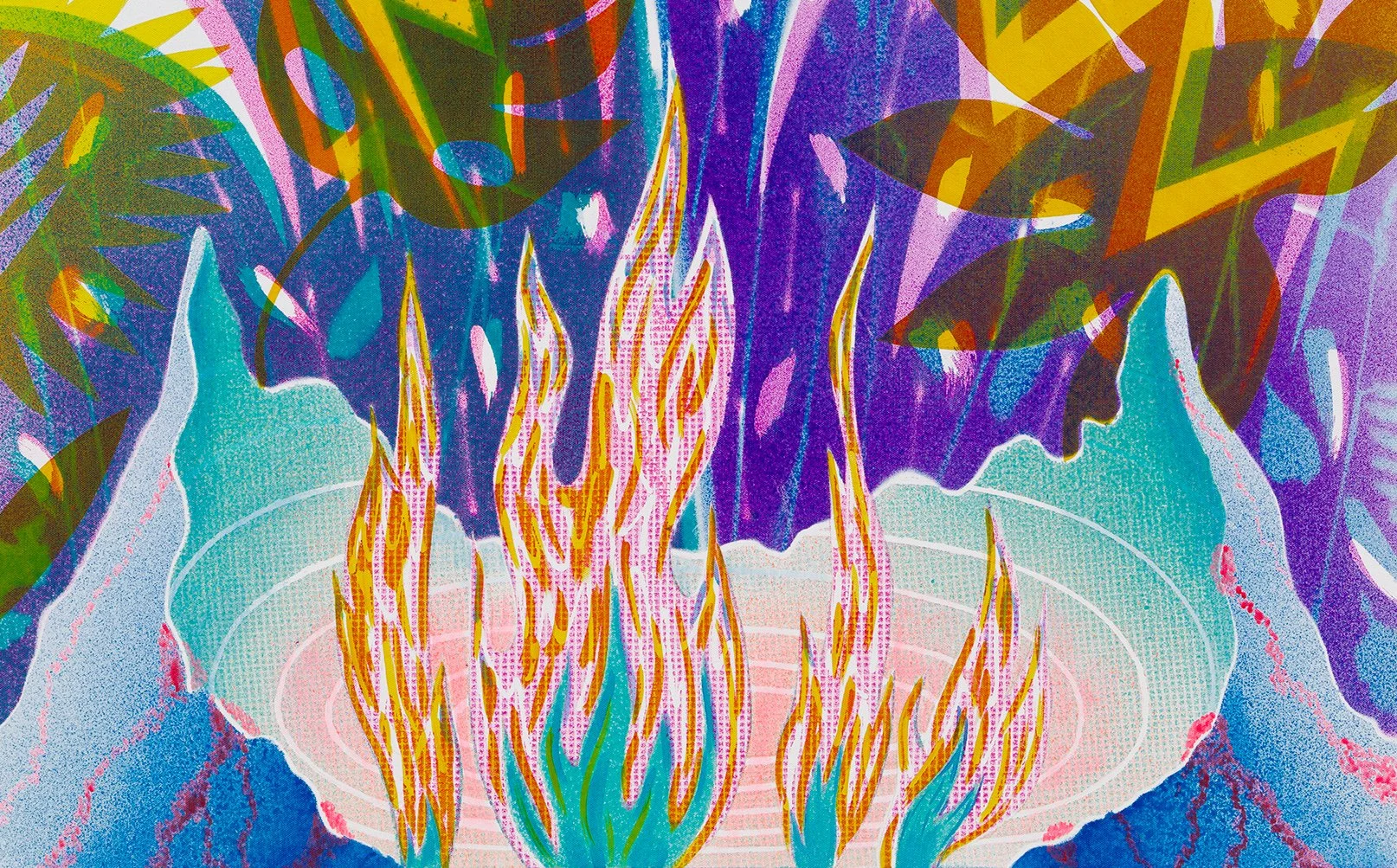 Maria Stabio’s paintings thematizes a variety of elements related to her Philippine heritage. By layering stencils and paint, Stabio achieves a non-uniform surface, shadow effects, and fine dot patterns within crisp outlines. Symbols of environment such as bubbling lava, lightening bolts, palm fronds, and cumulus clouds overlap, while basketballs released into the air from open hands and spoons and forks surrounding an egg, reference popular traditions and shared meals. As Alex Santana writes, “Stabio’s images are an amalgamation of evocative, dreamlike components that operate like how memory works: effervescent, elusive, and determined by one’s own psychological and spiritual proximity.'“ Maria Stabio was born in 1985 in San Francisco, CA and lives and works in Barnesville, Pennsylvania. She received a BFA in Painting from Boston University in 2007 and an MFA in Visual Arts from Columbia University in 2012.